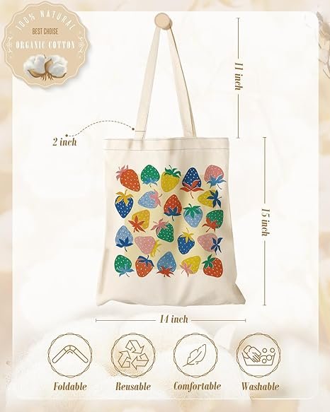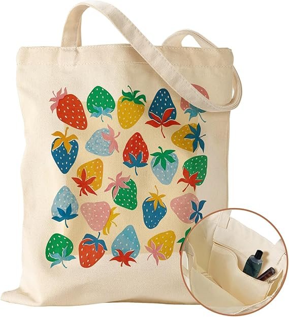 Aesthetic Canvas Tote Bag with Inner Pocket for Women, Cloth Cotton Totes Bag with Pattern for Shopping, Gym(Colorful Stawberry)