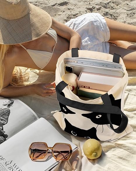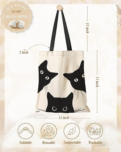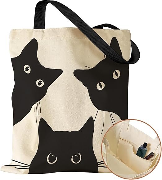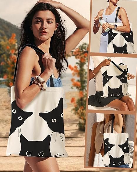Aesthetic Canvas Tote Bag with Inner Pocket for Women, Cloth Cotton Totes Bag with Pattern for Shopping, Gym(Three Black Cat)